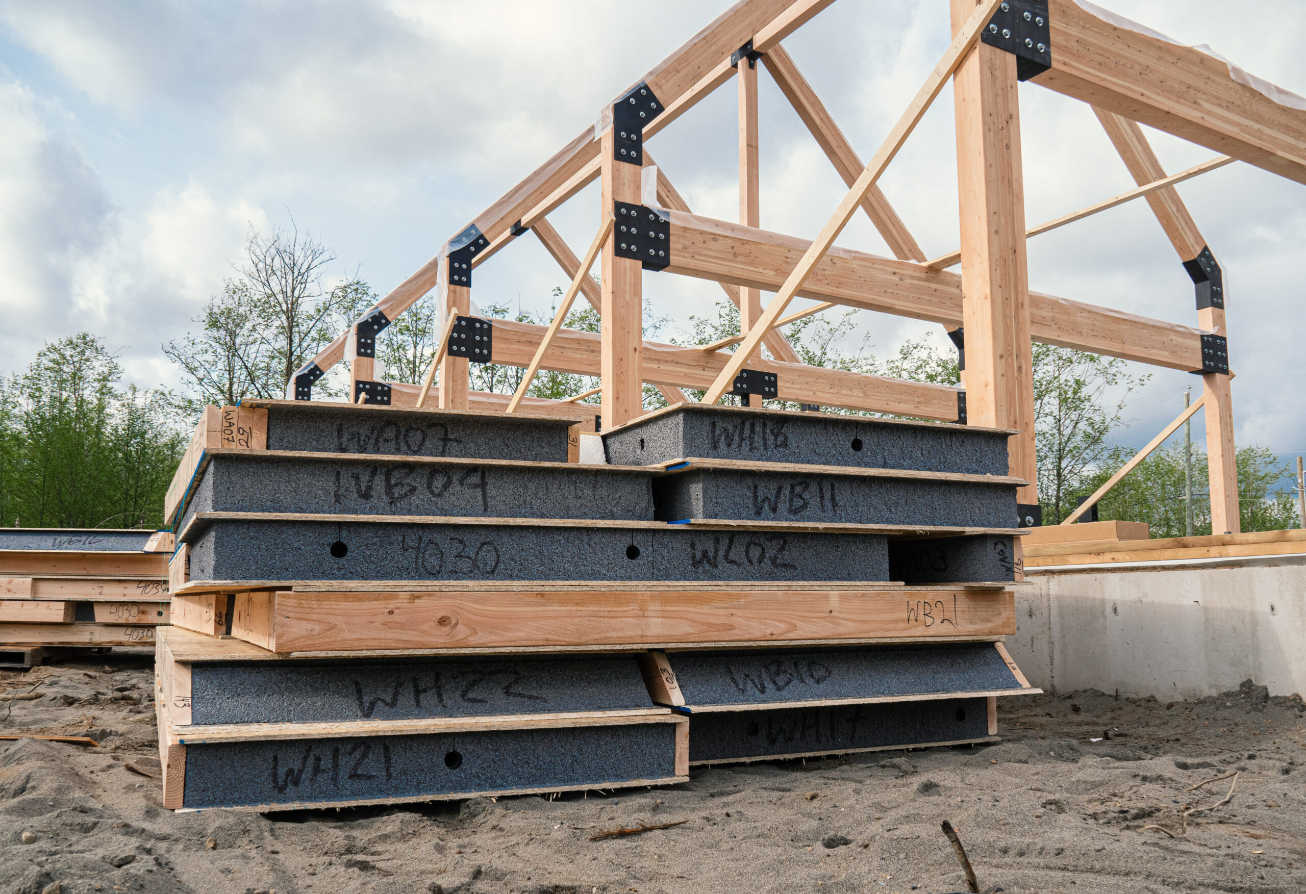 Pre-insulated wall panels are factory-built structural panels designed for high energy performance. Using expanded polystyrene insulation, they provide consistent thermal values from approximately R-22 to R-36 depending on panel thickness. Because they are precision-built in our controlled environment, the panels help achieve excellent airtightness and reduce heat loss across the entire building envelope.