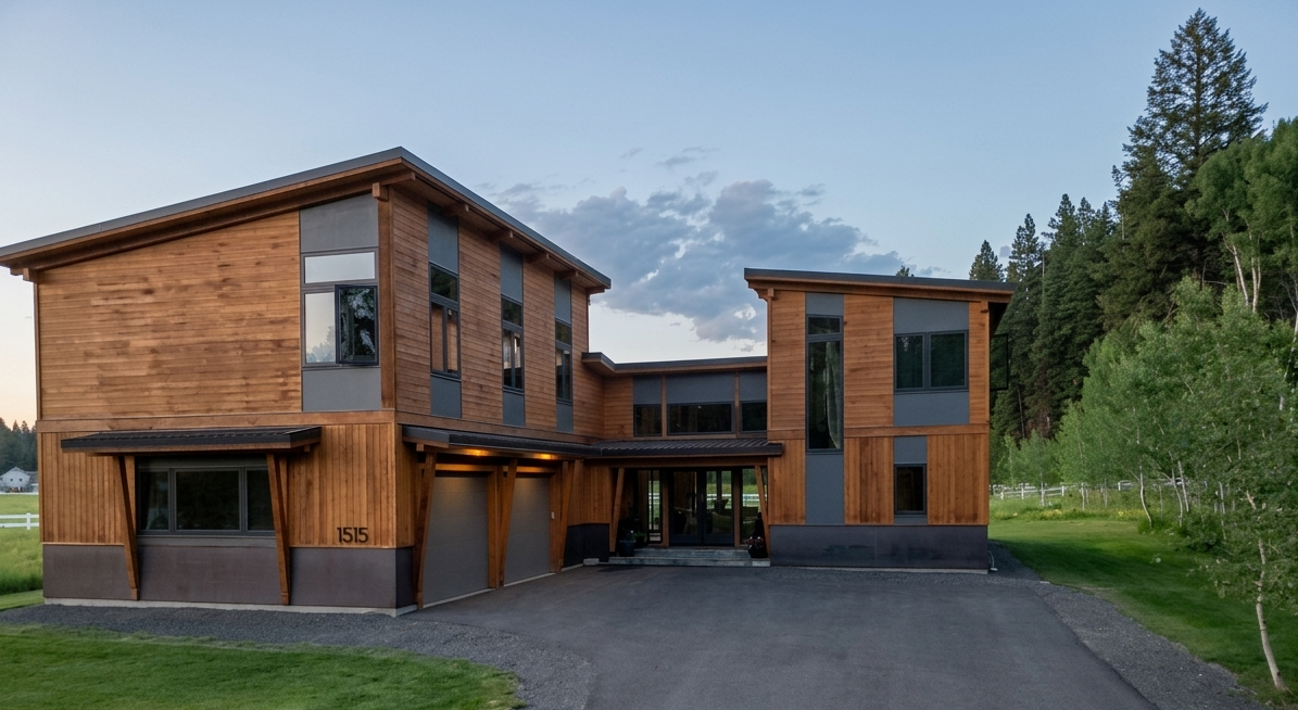 This custom Idaho home reflects a modern interpretation of mountain architecture, designed with a focus on clarity of form, natural light, and long-term livability. The composition balances clean, contemporary lines with natural materials, creating a home that feels both grounded and refined within its setting.