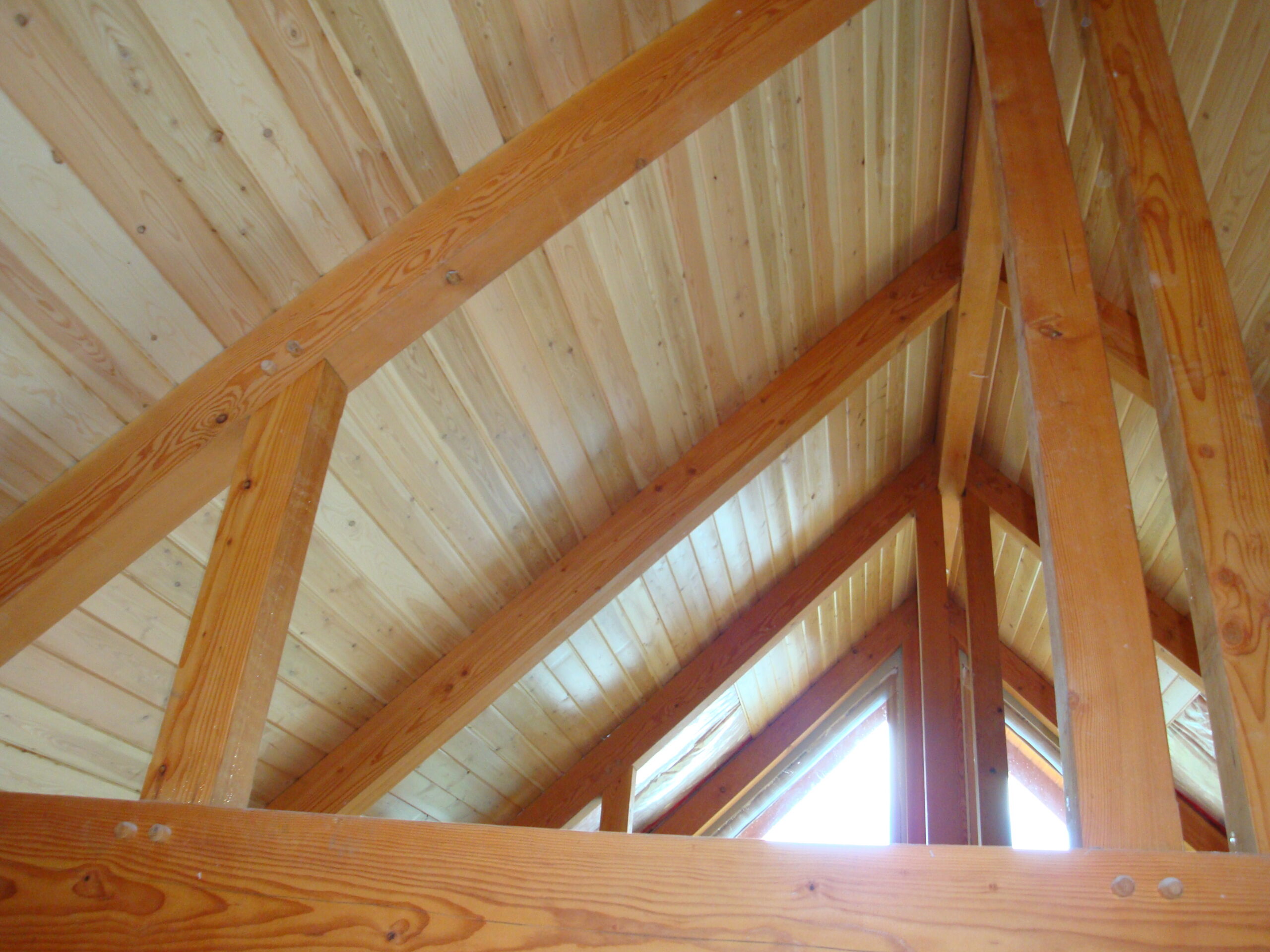 Inside, the home opens into a dramatic great room where the full height of the structure is expressed. The ceiling rises to 19 feet, finished in tongue and groove wood and supported by exposed timber beams that draw the eye upward and across the space. The slope and continuity of the wood ceiling create a sense of movement, while the warmth of the material softens the scale, balancing openness with a grounded, intimate feel. This space becomes the defining element of the home, where structure, material, and light come together to shape the overall experience.