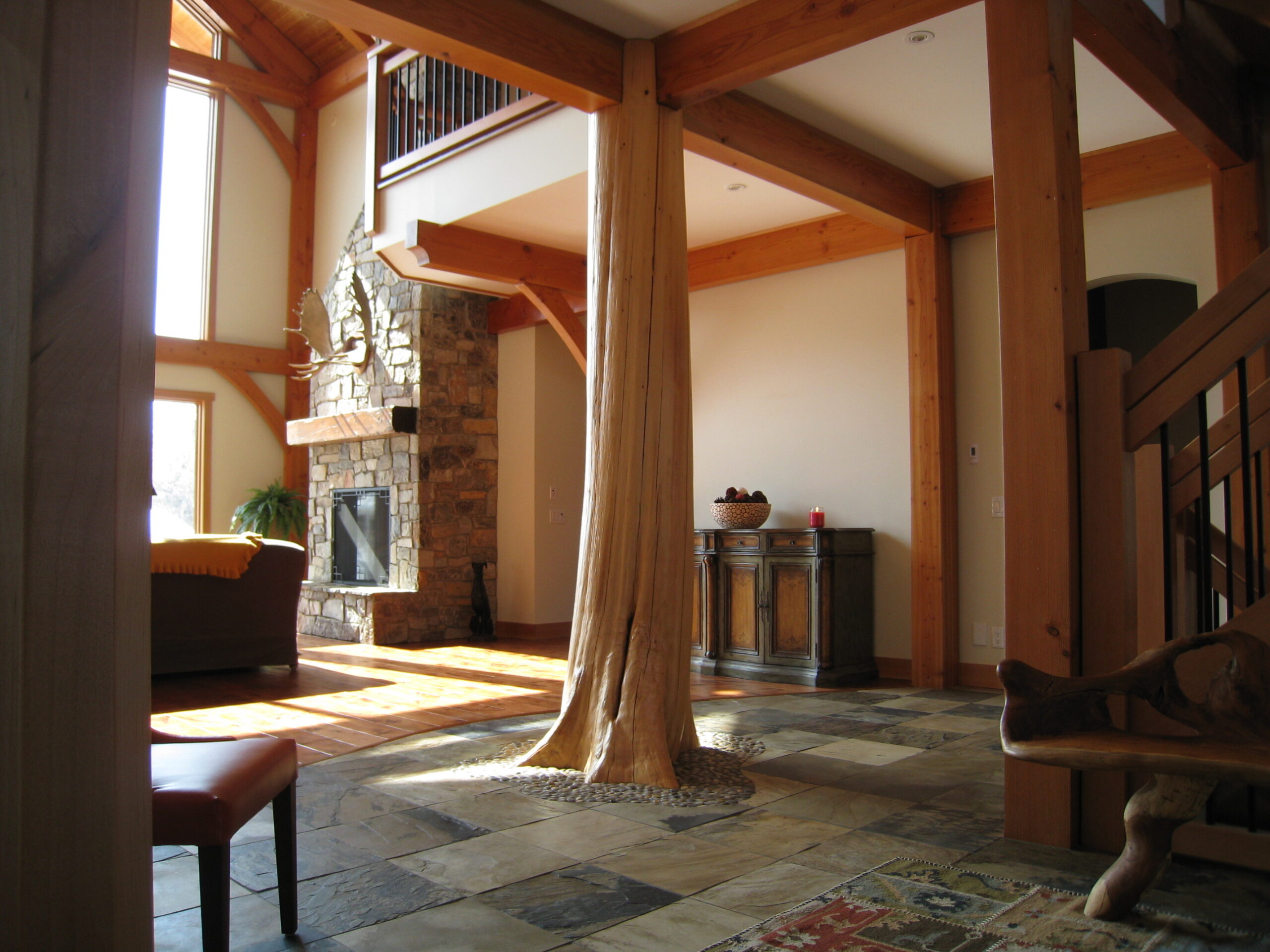 From the moment you arrive, the home signals that it is something special. At the entrance, full tree trunks replace traditional posts, framing a custom front door and establishing the natural material language that carries throughout the design. Inside, this concept continues with two massive trees set into beds of smooth river rock, rising to support the second-floor loft. These natural structural elements create a grounded and sculptural presence that connects the home directly to its surroundings.